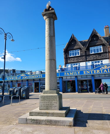 The column was at first set by the Mowlem Institute, nearer the sea. However, erosion by waves and, ironically, a series of storms, undermined the column and it collapsed in 1883 (this was before the sea wall was built). However, it was swiftly rebuilt. In 1965, it was moved along slightly to its present location on Shore Road to make way for development. In 1983, it was given the status of a Grade II listed monument, a vindication of Mowlem's vision perhaps, but certainly recognition of its place among Victorian public architecture, and of Alfred's place in our nation's history.